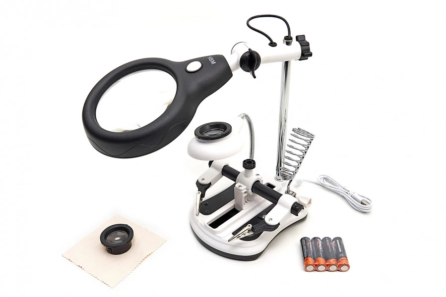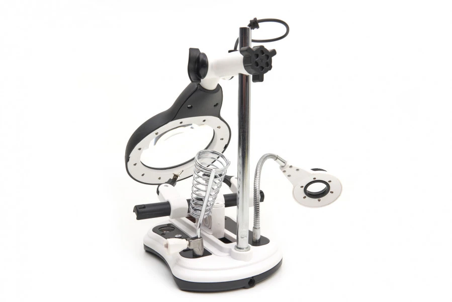 De twee armen en afstelbare hulpklemmen geven je alle nodige flexibiliteit bij het gebruik van deze lamp. Daarbij is de soldeerbouthouder spiraalvormig, voor meer grip en controle. Bij de lamp krijg je 4 AA penlight batterijen, zodat je meteen aan de slag kunt.