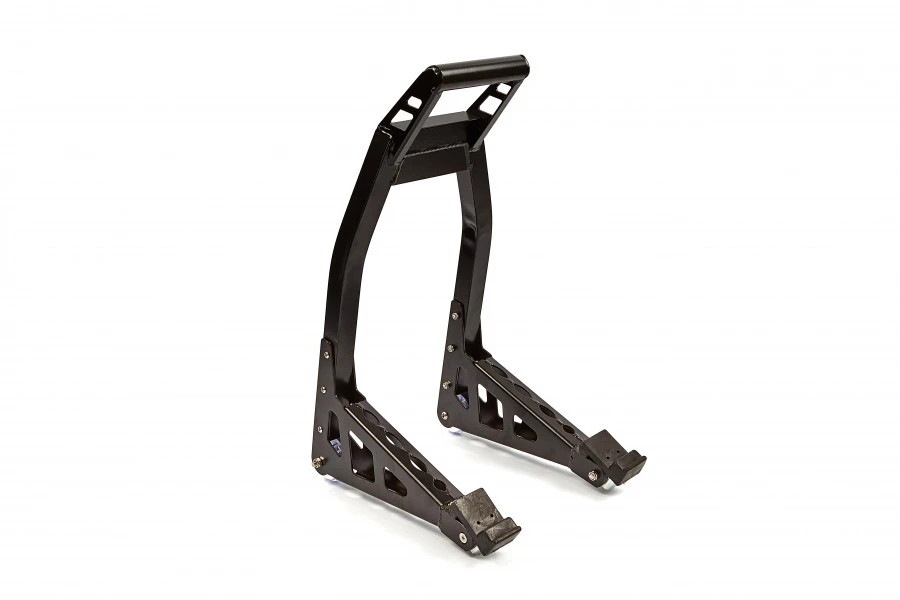 Deze stand is een must-have uitbreiding voor de uitrusting van races op een circuit. Dankzij de specifieke positionering van je motorfiets haal je de bandenwermars snel van de motor en dat op een veilige manier. Hierdoor verlies je minder tijd. Vervolgens krijg je bij de stand rubberen adapters gegeven, zodat je de motor niet zomaar beschadigt. Ten slotte hanteer je de stand snel en veilig voor middel van een geïntegreerd metalen handvat aan de bovenzijde. Zo heb je altijd de controle over het systeem en voorkom je schade.