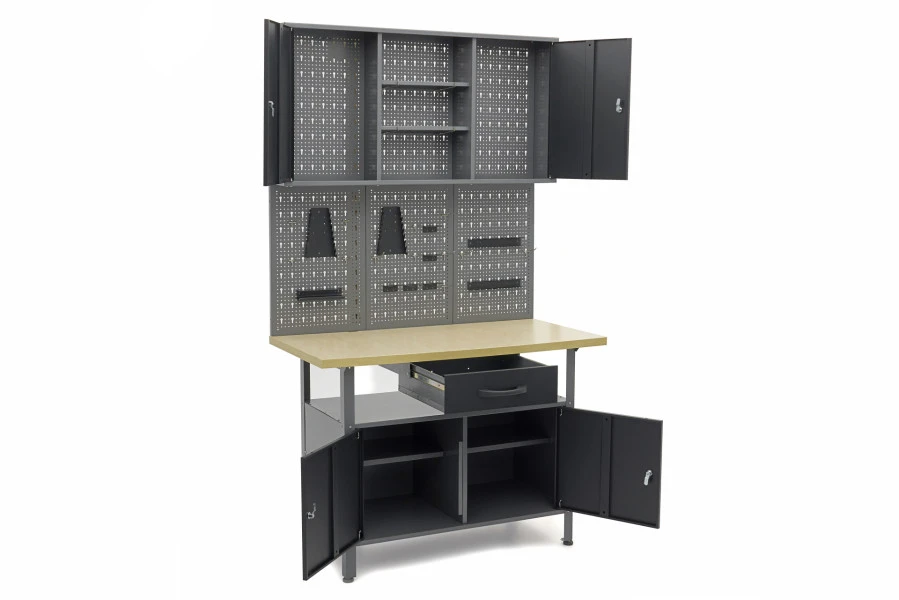 In je werkplaats wil je jouw gereedschap eenvoudig op kunnen bergen. En je hebt ook werkruimte nodig om op te kunnen klussen. Daarom is een deze HBM werkbank die gecombineerd is met achterwanden en kasten ideaal. Zo heb je de ruimte om diverse werkzaamheden te kunnen doen en kun je jouw gereedschap en kleine materialen handig opbergen. De werkbank is voorzien van meerdere kasten, een lade en twee planken. Daarnaast bieden de perfowanden de mogelijkheid om je gereedschap op te hangen.