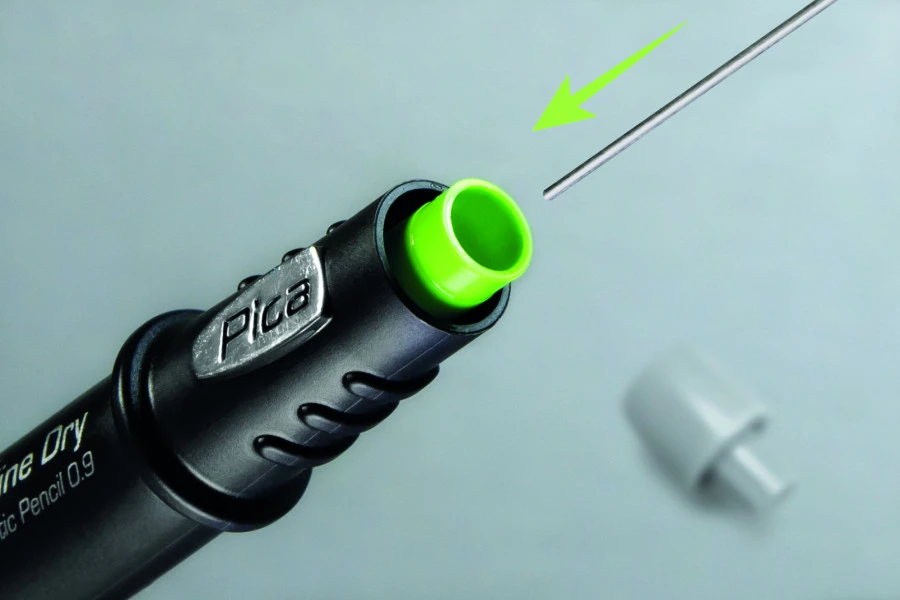 De Pica Fine Dry met speciale puntdiameter van slechts 0,9 mm is perfect voor fijne en exacte markeringen zonder te slijpen. De grote geïntegreerde gum maakt snelle correcties mogelijk. Standaard inbegrepen zijn 5 grafietstiften in HB.