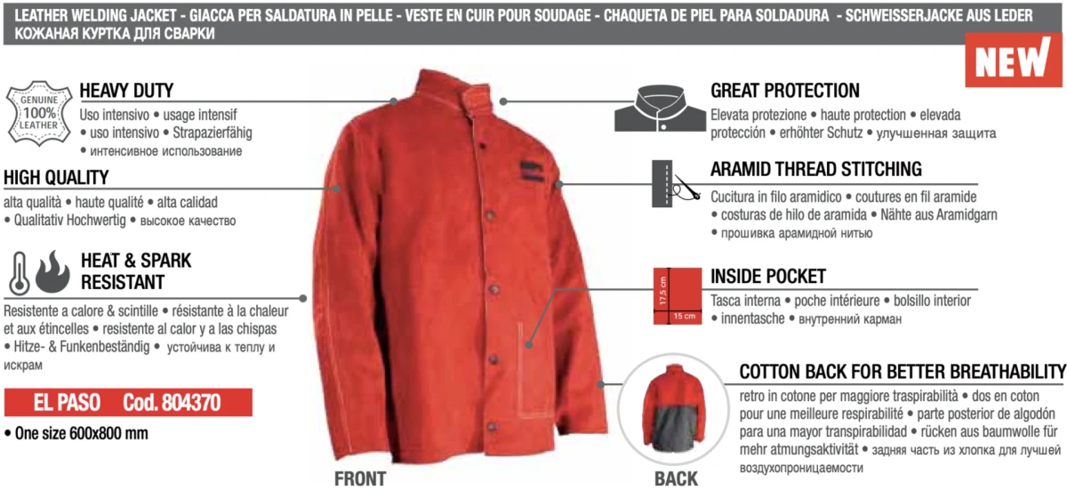 De El Paso lasjas van Telwin is een nette en hoogwaardige jas. Met deze jas is het veilig lassen. De Telwin El Paso is soepel en lichtgewicht en daarmee makkelijk om in te werken. Deze lasjas is in 1 maat beschikbaar. De jas heeft een goede bescherming tot bovenin de nek. De jas is uiteraard hitte en vonk-bestendig. De naden zijn gestikt met aramide garen (aramide garen bevatten vlamvertragende – en hittebestendige eigenschappen).